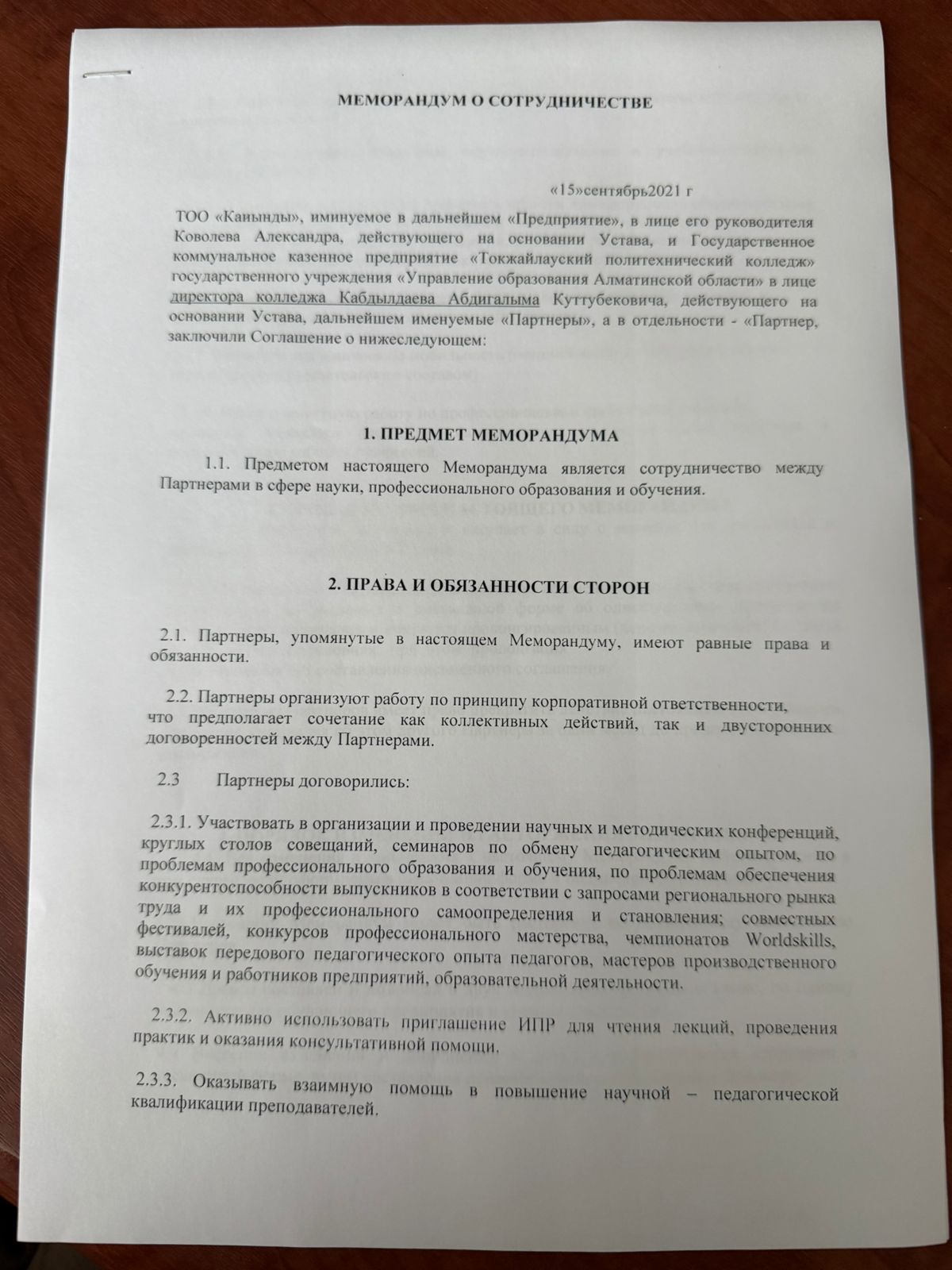 «МЕМОРАНДУМ О СОТРУДНИЧЕСТВЕ»
